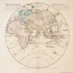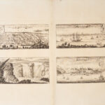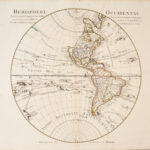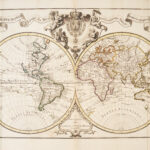 Parmi les cartes les plus remarquables figure la fameuse carte de l’Amérique du nord A Map of the British Empire in America d’Henry Popple, publiée à l’origine en 1733, véritable jalon de la cartographie coloniale. Cette vaste carte murale doit beaucoup au travail préparatoire du géographe Clément Lempriere (1683-1746), dessinateur du Board of Trade, qui fournit à Popple une grande partie des levés, esquisses et annotations, notamment pour les régions côtières et les colonies britanniques. L’ouvrage rassemble les sept feuilles de l’édition par Covens et Mortier, dont la key map en premier état (Amsterdam, vers 1737, reconnaissable au terme Hollandish dans le cartouche, remplacé par The Dutch dans le second état), ainsi que les quatre cartes particulières publiées séparément, chacune avec son propre titre et pouvant être montées : 1. Baye d’Hudson, Pays des Kilistinons &c. – 2. Nouvelle Bretagne, Nouvelle France, Nouvelle Ecosse, Nouvelle Angleterre, Nouvelle York, Pensilvanie, &c. – 3. Caroline méridionale, Floride, Louisiane, Mexique, Jucatan, &c. – 4. Isles de Bermude, la Jamaïque, &c. S’y ajoutent les cartes et plans des principales forteresses et ports de l’Amérique septentrionale (sur une feuille), ainsi qu’une planche double figurant les vues de Mexico, des chutes du Niagara, de New York et de Québec.